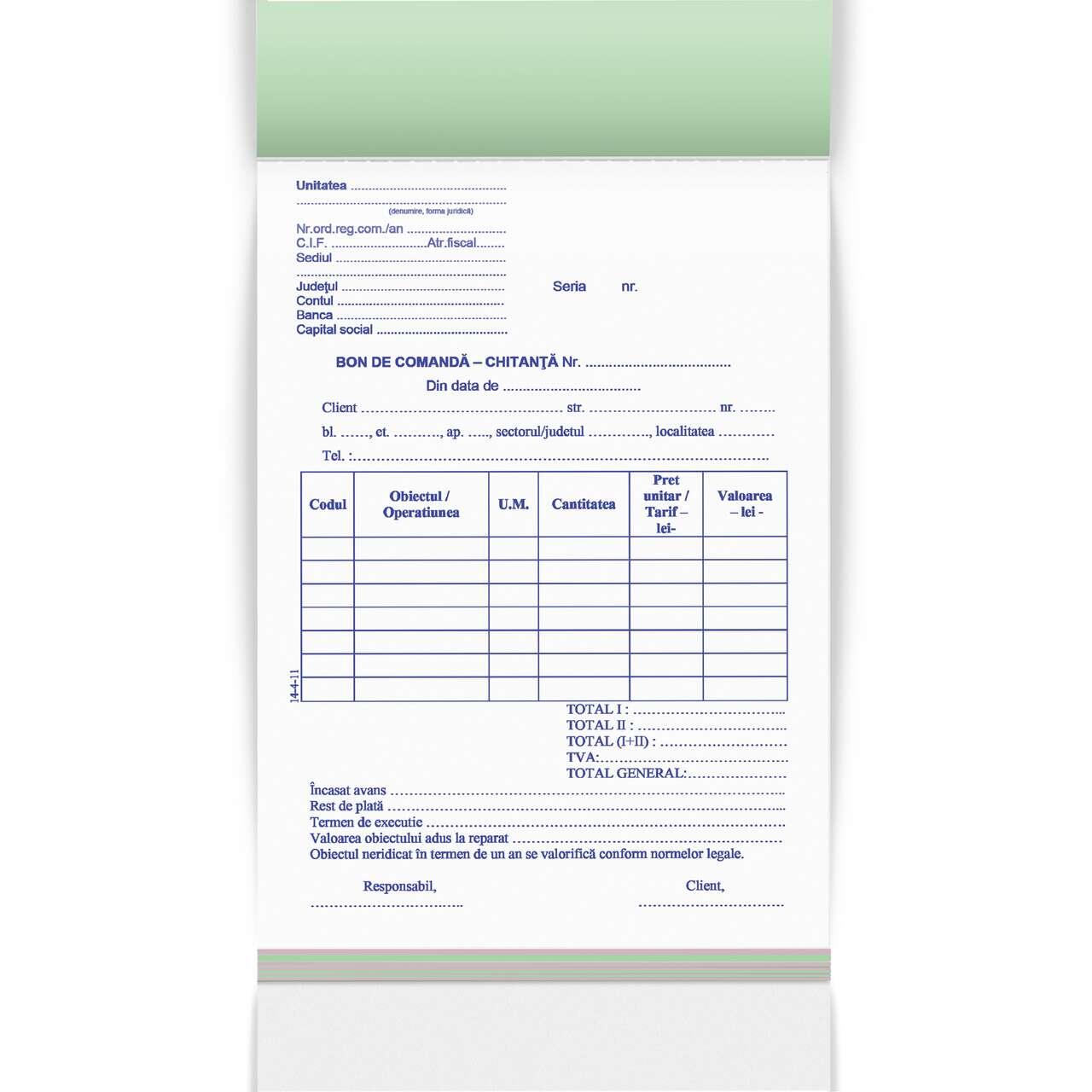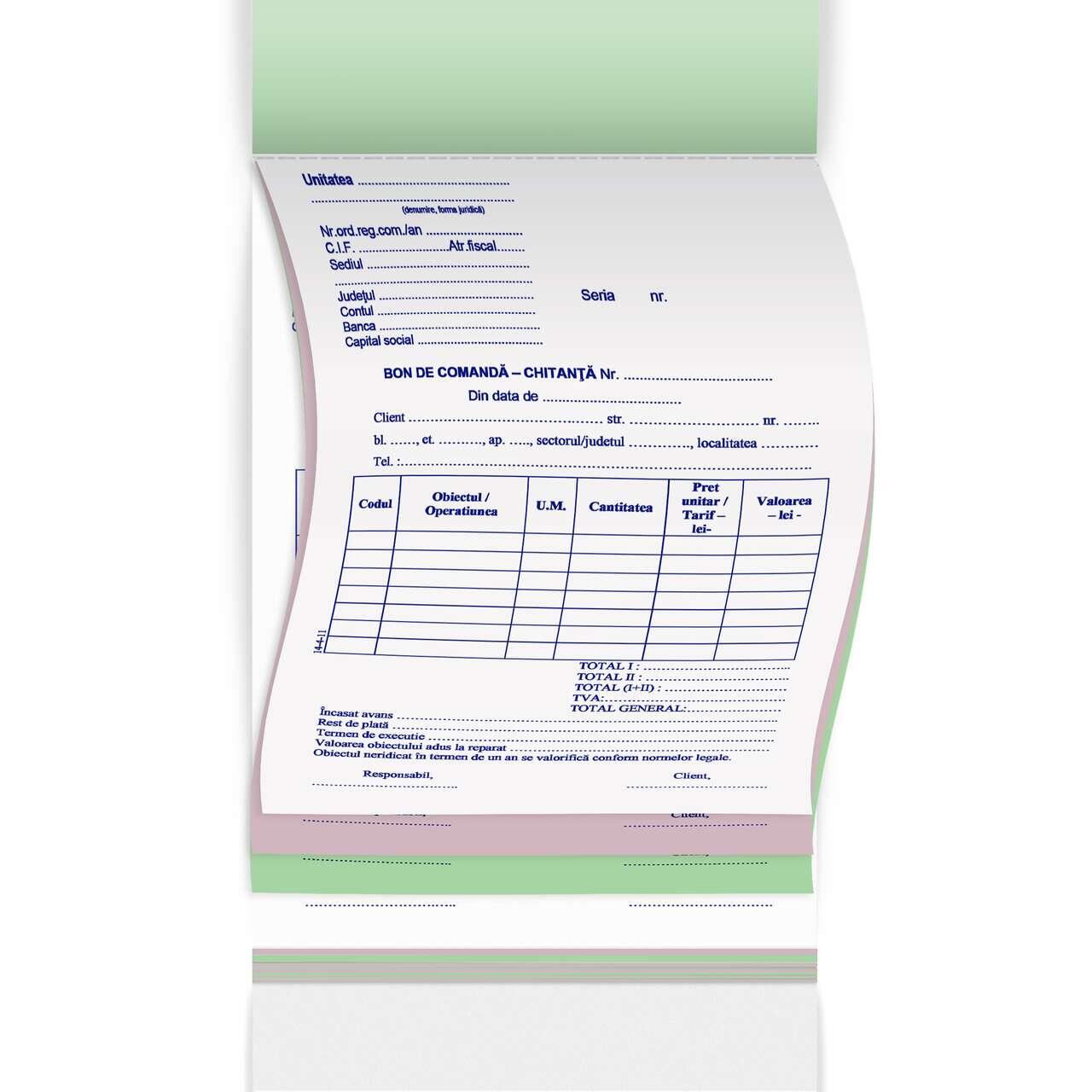 Bon comanda chitanta A5 in trei exemplare este disponibil in carnete de 150 de file (50 de seturi) tiparite cu albastru pe hartie autocopiativa, primul exemplar alb, al doilea exemplar roz, al treilea exemplar verde, microperfor pentru o rupere usoara, coperta alba in fata, coperta spate din carton duplex (dubla, pentru a o fixa sub imprimatul folosit si a evita imprimarea pe mai multe seturi), legare prin capsare.