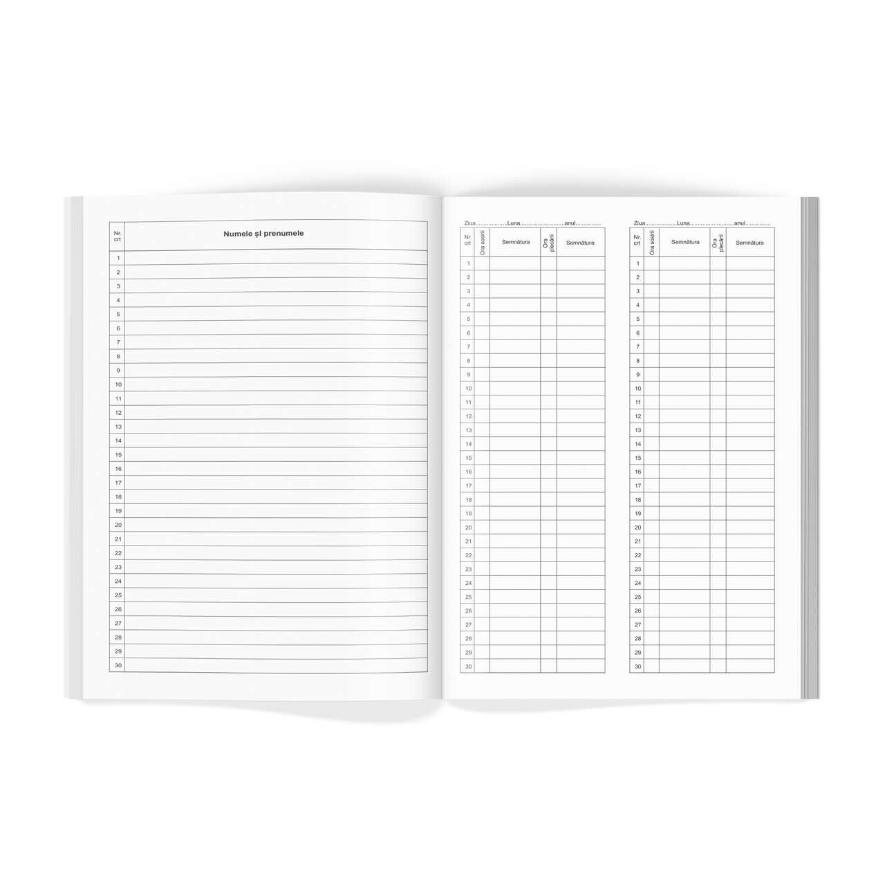 Condica de prezenta este disponibila in carnete A4 de 100 de file tiparite pe hartie offset super white 60 g, coperta fata-spate din carton duplex de 250g, legate prin capsare. Cumperi 18 si primesti 2 GRATIS!