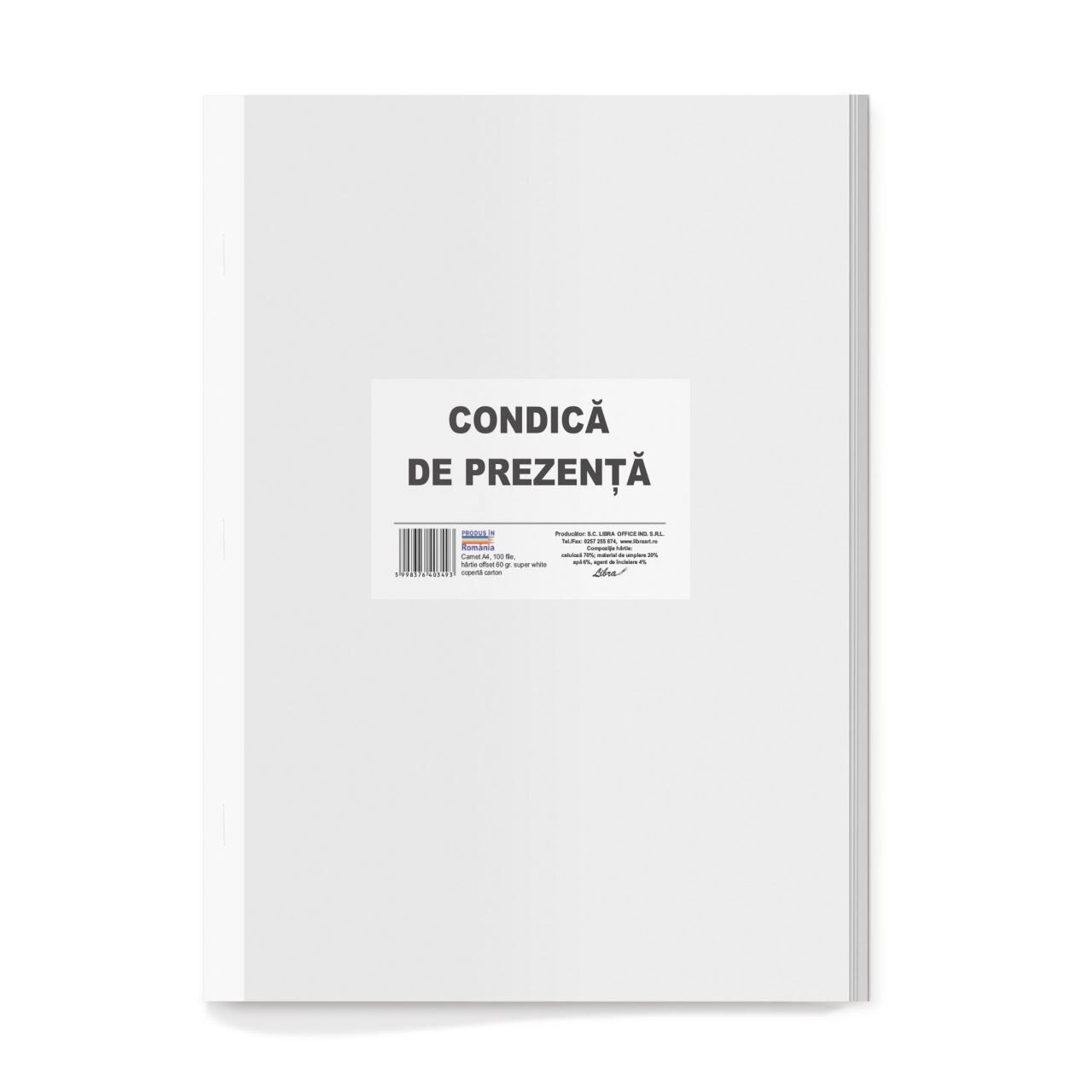 Condica de prezenta este disponibila in carnete A4 de 100 de file tiparite pe hartie offset super white 60 g, coperta fata-spate din carton duplex de 250g, legate prin capsare.
