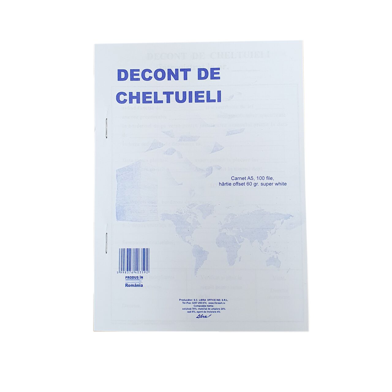 Decontul de cheltuieli este disponibil in carnete A5 a cate 100 de file tiparite pe hartie offset super white 60 g, tipar fata/verso cu coperta alba fata-spate, legate prin capsare.