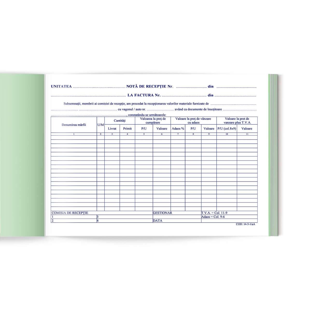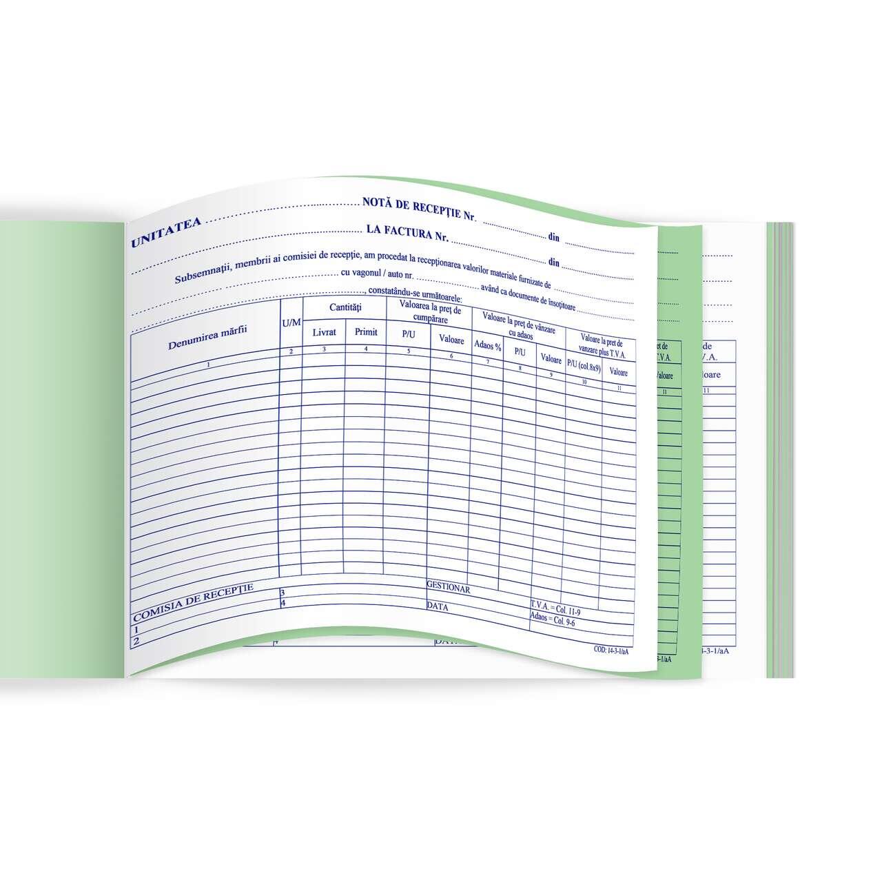 Nota de receptie si constatare de diferente A4 cu 11 de coloane, autocopiativa in doua exemplare, carnet de 100 de file (50 de seturi) hartie alb/verde. Cumperi 18 carnete si primesti 2 GRATIS!