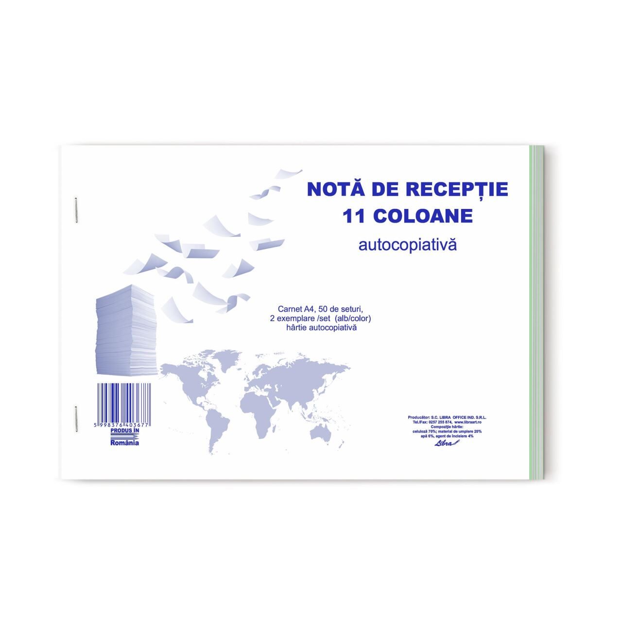 Nota de receptie si constatare de diferente A4 cu 11 de coloane, autocopiativa in doua exemplare este disponibil in carnete de 100 de file (50 de seturi) tiparite cu albastru pe hartie autocopiativa, primul exemplar alb, al doilea exemplar verde, coperta alba in fata / verso, legare prin capsare.