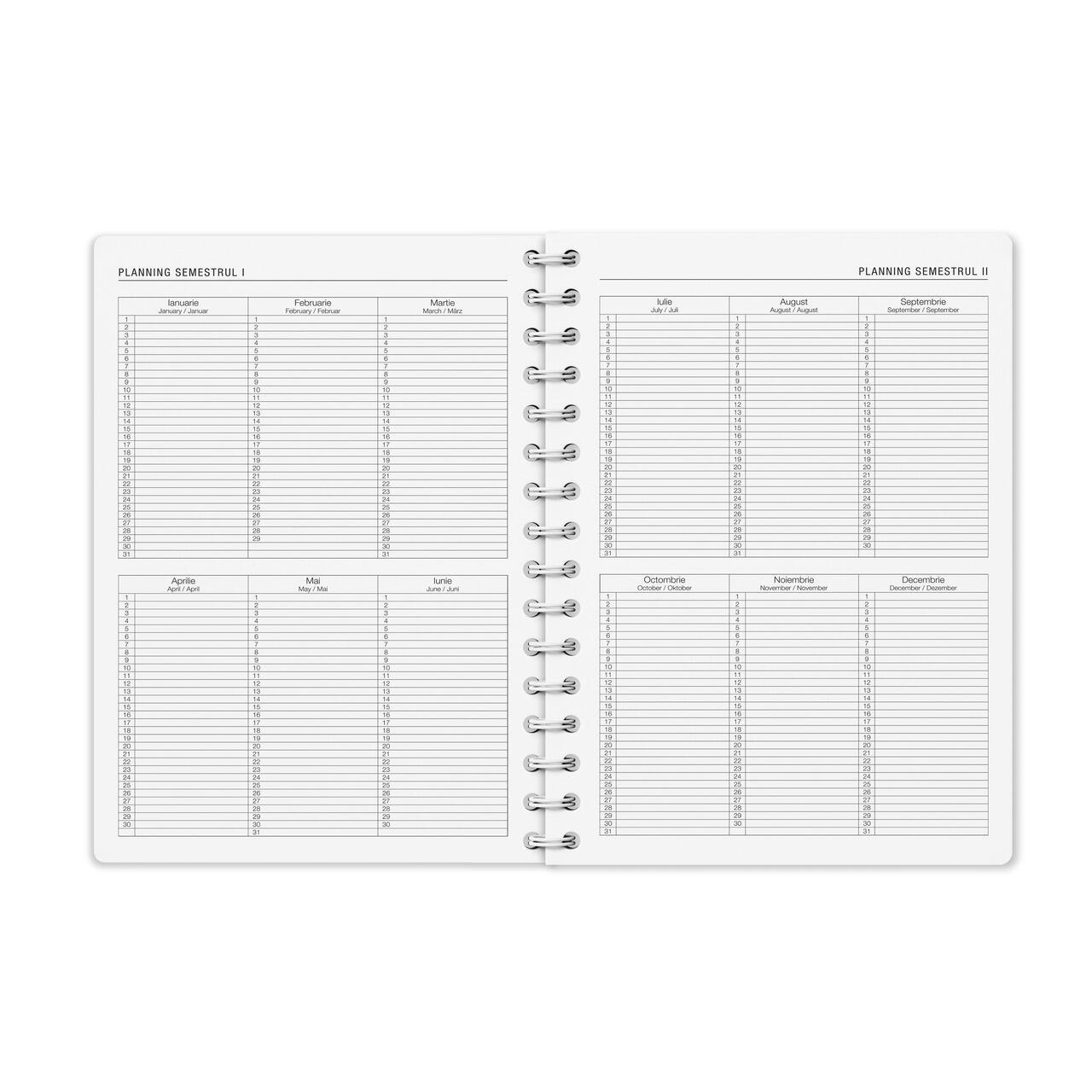 Design premium, cu copertă frontală și posterioară din carton de 300 g, prevăzută cu imprimare policromie vibrantă, și protecție suplimentară din supracopertă PriPlak transparentă, care păstrează un aspect rafinat. Primele 8 pagini conțin informații utile și un planificator săptămânal pentru o organizare eficientă.