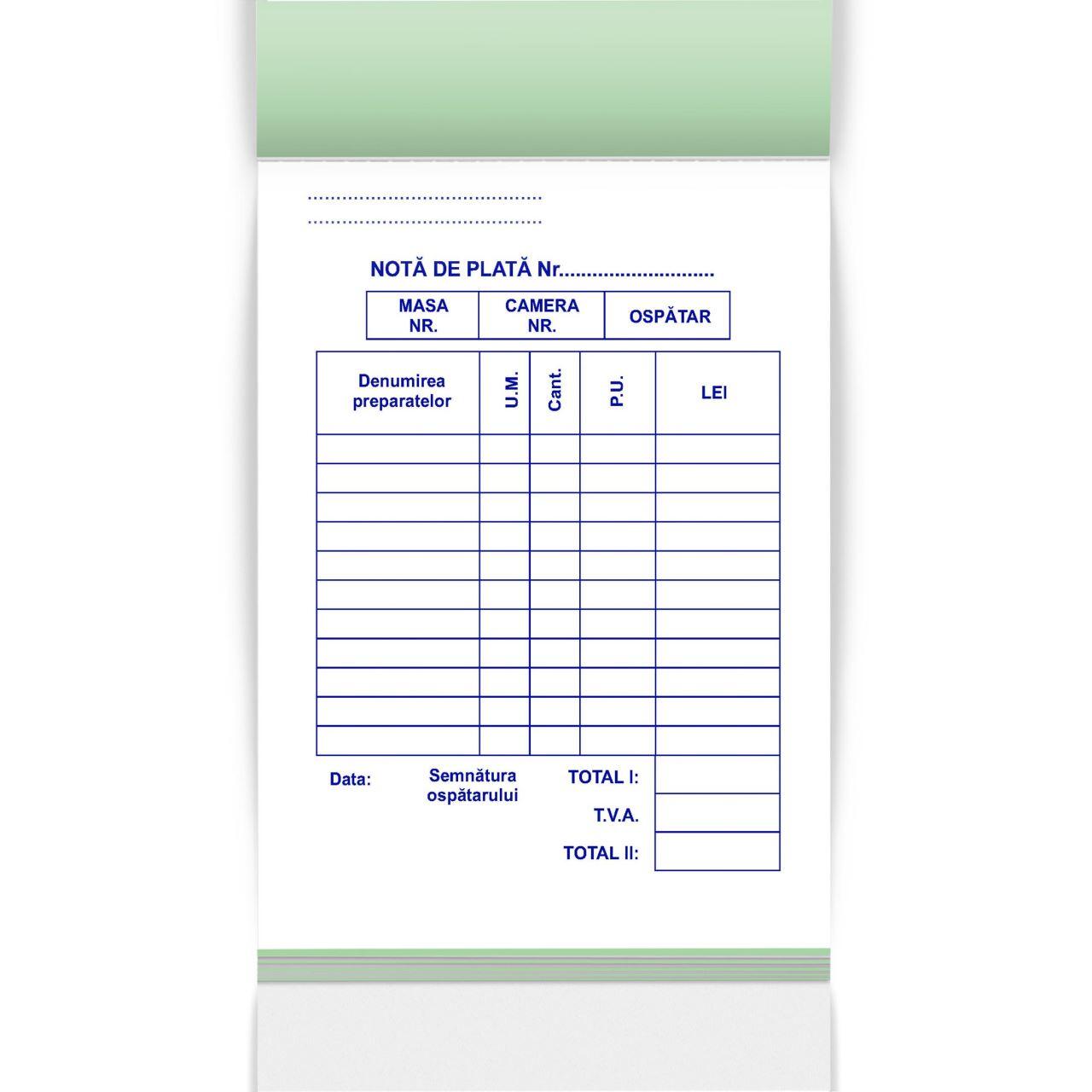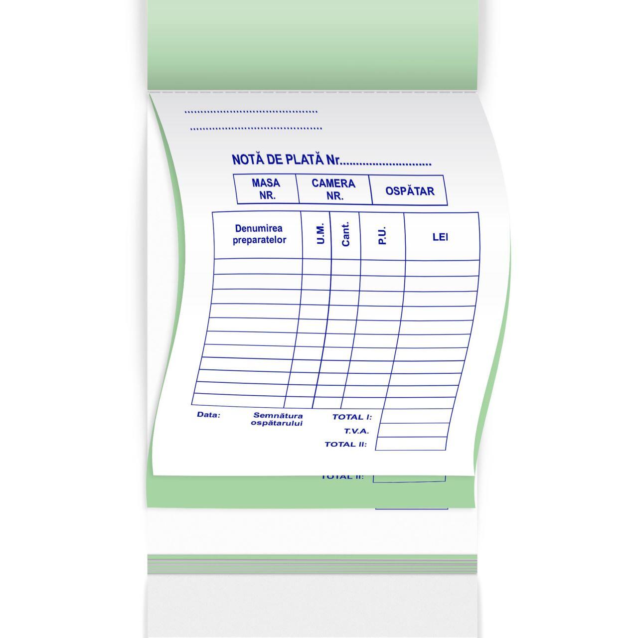 Nota de plata ospatar este tiparita in carnete A6 a cate 100 de file (50 seturi autocopiative), tiparite pe hartie alb/verde, coperta alba fata, legate prin capsare. La 36 buc cumparate primesti 4 GRATIS!