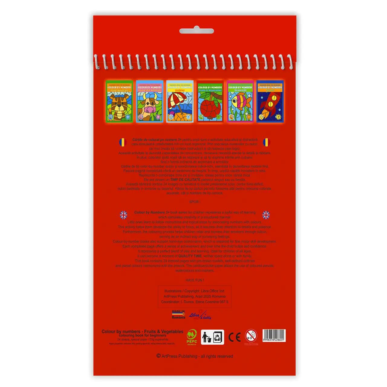 Carte de colorat pe numere 3+ pentru copii incepatori, format A4 (210x297 mm), 24 imagini tiparite pe carton de 170g fata, legare cu spirala de plastic continua. La 4 bucati cumparate primesti 1 GRATIS!
