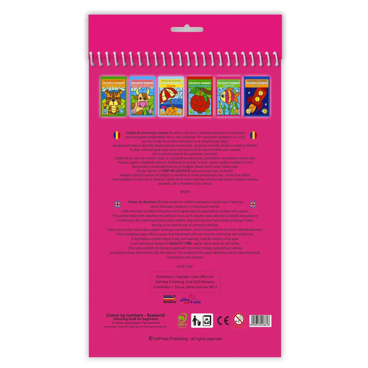Carte de colorat pe numere 3+ pentru copii incepatori, format A4 (210x297 mm), 24 imagini tiparite pe carton de 170g fata, legare cu spirala de plastic continua. La 4 bucati cumparate primesti 1 GRATIS!