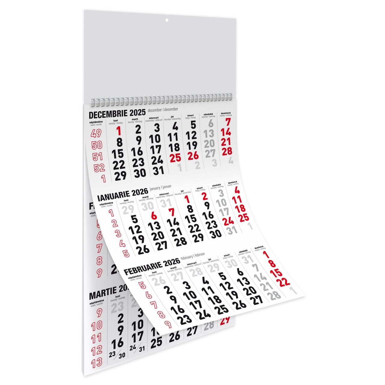 Calendar triptic format A3 (297x420 mm) contine 12 file de hartie mata 120g legate cu spirala cu spirala metalica dubla, tipar cu negru si rosu, spate din carton duplex 250g, header de 30x14 cm confectionat din carton duplex de 500g (foarte rezistent).