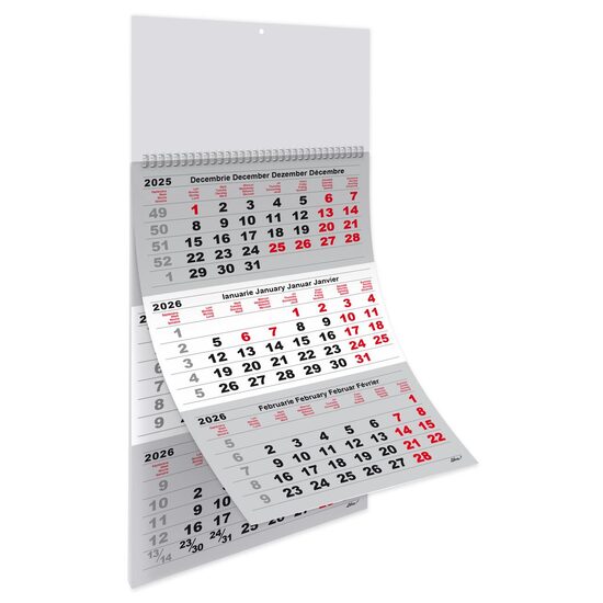 Calendar triptic 2026 format A3 (297x420 mm), contine 12 file de hartie lucioasa 120g legate cu spirala cu spirala metalica dubla, tipar cu gri si rosu, spate din carton duplex 250g, header de 30x14 cm confectionat din carton duplex de 450g.
