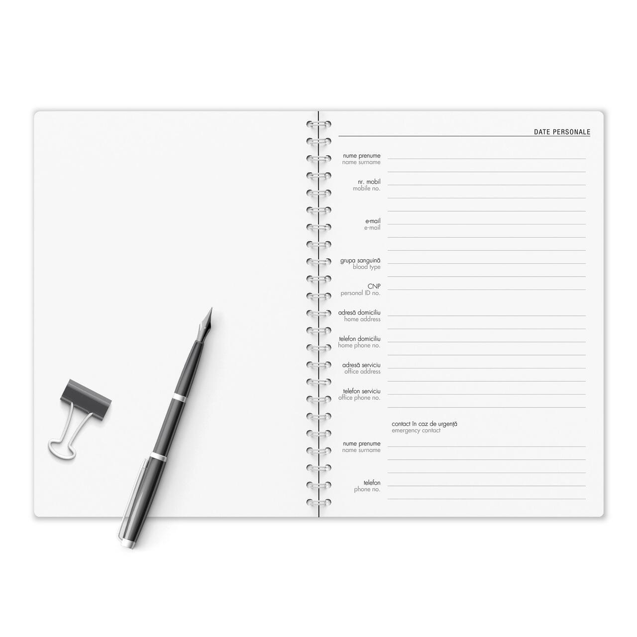 Designul elegat include copertă frontală și posterioară din carton de 300 g, cu imprimare policromie vibrantă, complementată de o supracopertă transparentă PriPlak ce protejează și accentuează stilul. Primele 8 pagini conțin informații utile și un planificator săptămânal pentru o organizare optimizată.