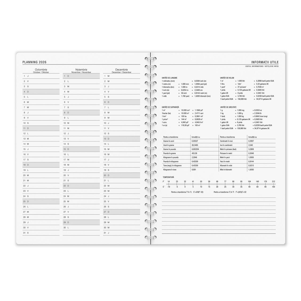 Designul elegat include copertă frontală și posterioară din carton de 300 g, cu imprimare policromie vibrantă, complementată de o supracopertă transparentă PriPlak ce protejează și accentuează stilul. Primele 8 pagini conțin informații utile și un planificator săptămânal pentru o organizare optimizată.