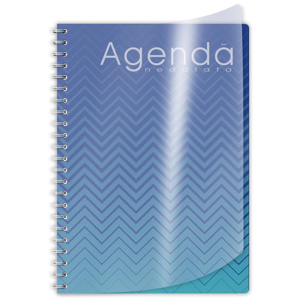 Agenda A4 nedatata, liniatura din interior tiparita cu gri, 208 pagini, hartie 70g, copertă fata/spate din carton de 300 grame tiparit policromie si supracoperta din PriPlak transparent.