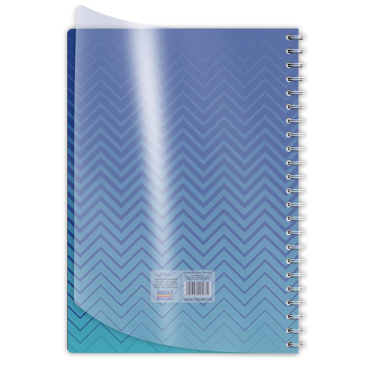 Agenda A4 nedatata, liniatura din interior tiparita cu puncte, 208 pagini, hartie 70g, copertă fata/spate din carton de 300 grame tiparit policromie si supracoperta din plastic transparent.
