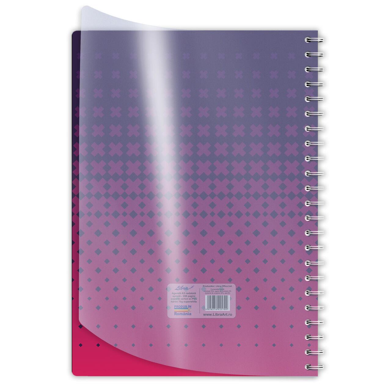Agenda A4 nedatata, liniatura din interior tiparita cu puncte, 208 pagini, hartie 70g, copertă fata/spate din carton de 300 grame tiparit policromie si supracoperta din plastic transparent.