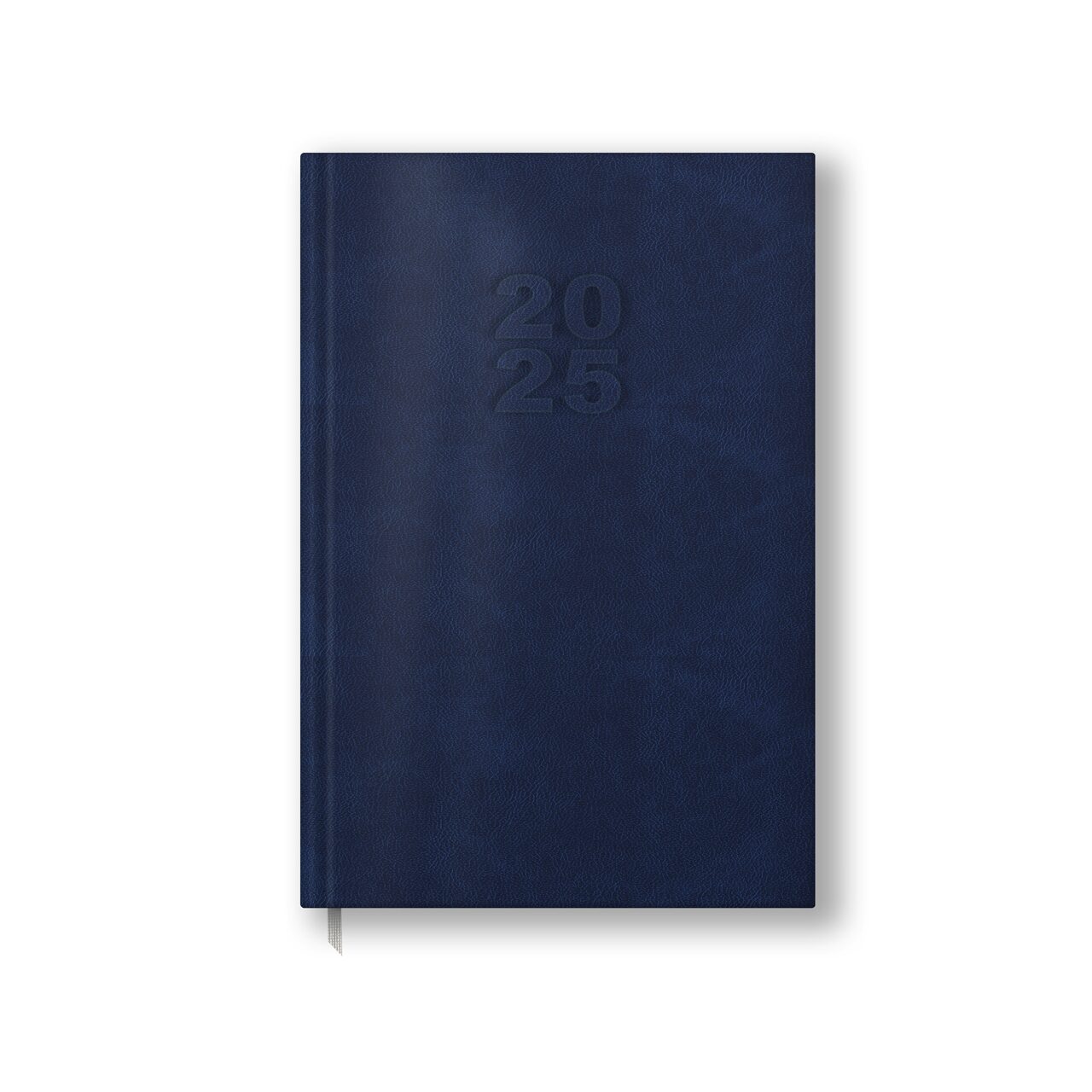 Agenda A5 datata zilnic, 272 pagini, hartie 70g, copertă carton buretat imbracat in balacron albastru, tipar interior la 2 culori, semn de carte, planificator saptamanal si informatii utile.