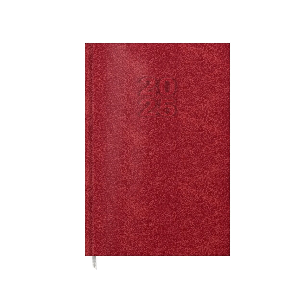 Agenda A5 datata zilnic, 272 pagini, hartie 70g, copertă carton buretat imbracat in balacron bordo, tipar interior la 2 culori, semn de carte, planificator saptamanal si informatii utile.