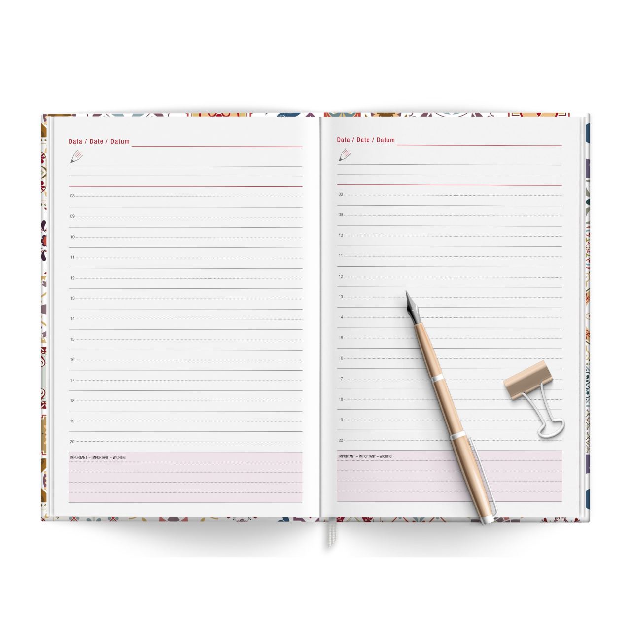 Agenda A5 nedatata 208 pagini, coperta carton buretat laminata lucios, interior hartie offset 80g tiparita color, cusuta, semn de carte, planificator saptamanal si informatii utile.