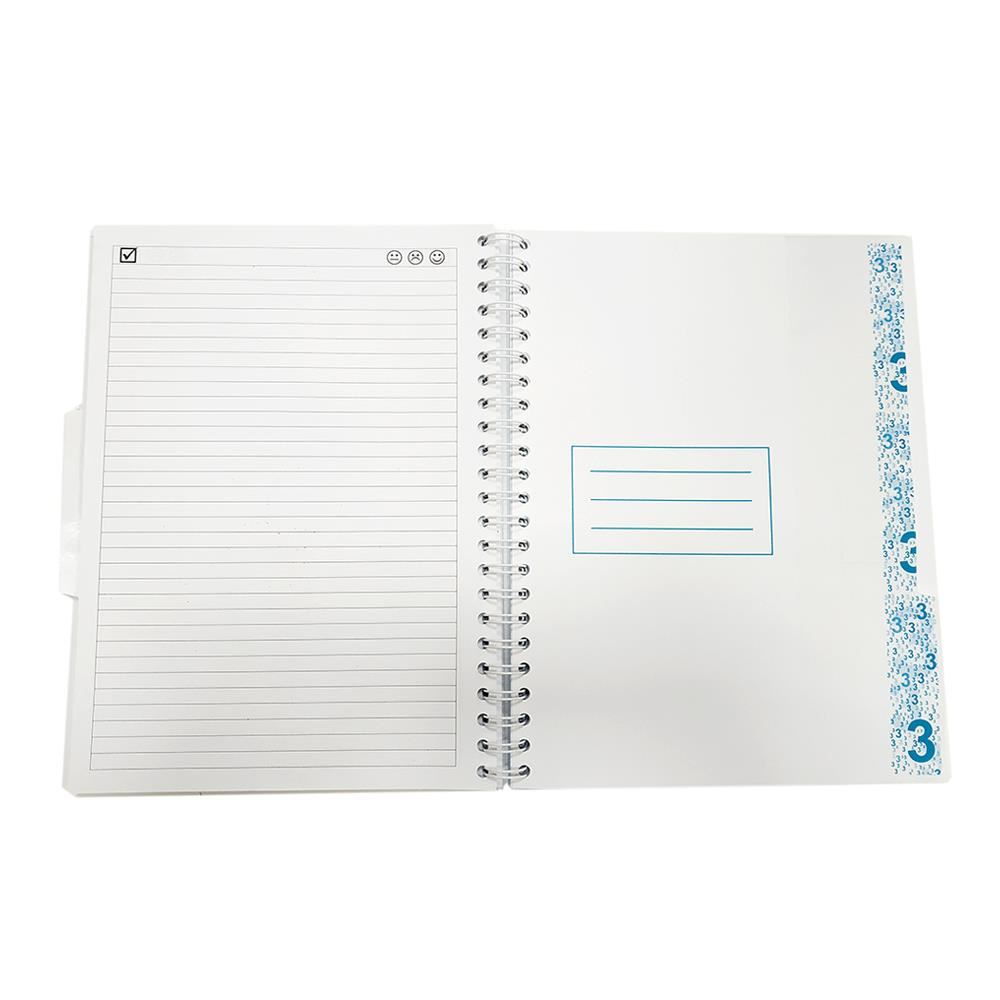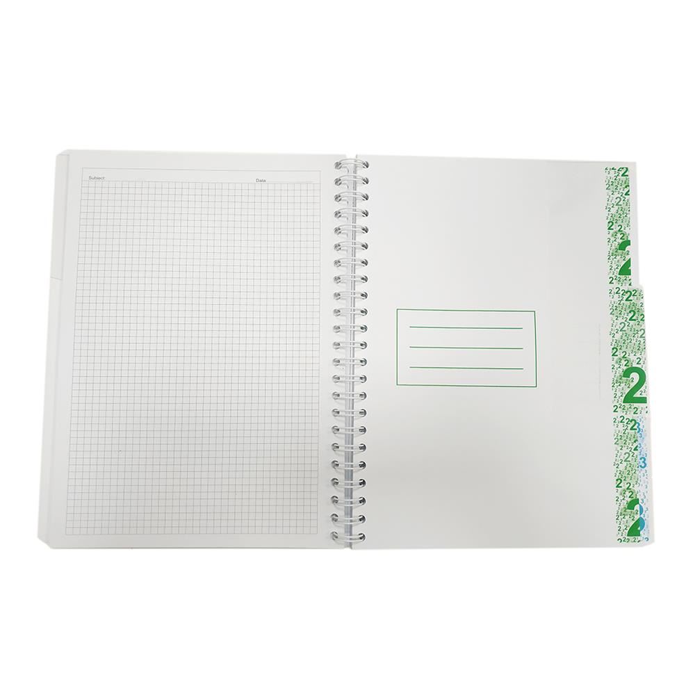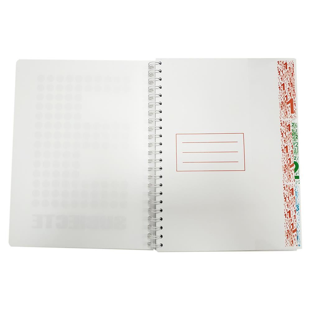 Caiet 3 subiecte format A4 cu 120 file, interior hartie liniata de foarte buna calitate cu grosimea de 70g/mp tiparita cu liniatura dictando 40 file matematica 40 file si velina 40 file, legare cu spira metalica, coperta fata si spate din plastic gros de 0.80 mm (800g/mp), colturi rotunjite. Separatoarele sunt din carton plastifiat in zona index, pentru a evita uzura unei folosiri intense.