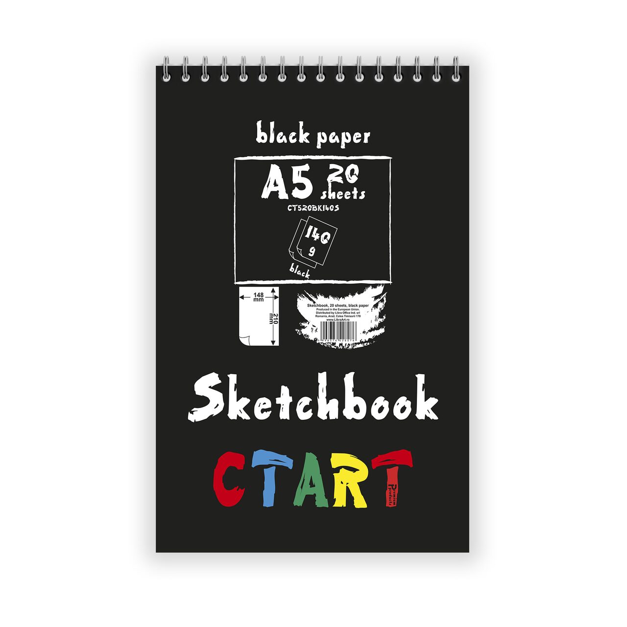 Caiet de schite format A5 (210x148 mm), 20 coli carton negru de 140g, legat cu spirala metalica dubla. Recomandat pentru tehnici mixte: marker, creion, carbune, grafit, acril, etc.