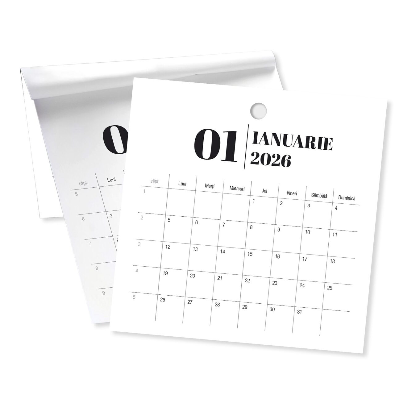 Calendar Organiser format 32x32 cm, 12 file hartie hartie 170g/mp mata; spate mucava cu grosime de 1.2mm – lipit in partea de sus, gaura pentru agatat de 2.5 cm.