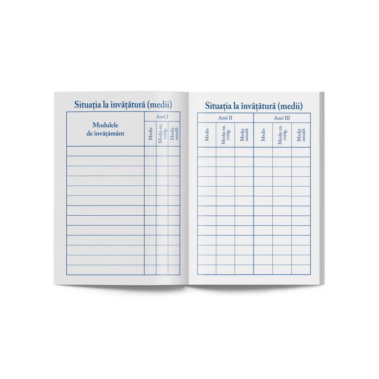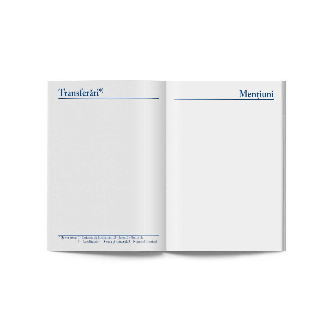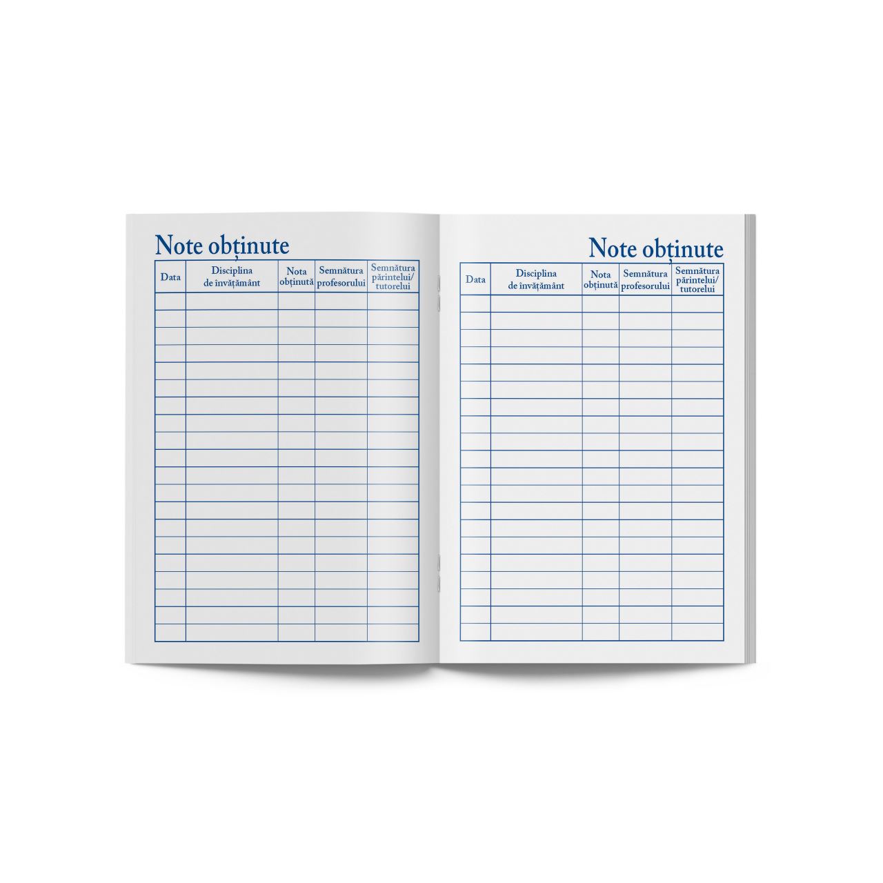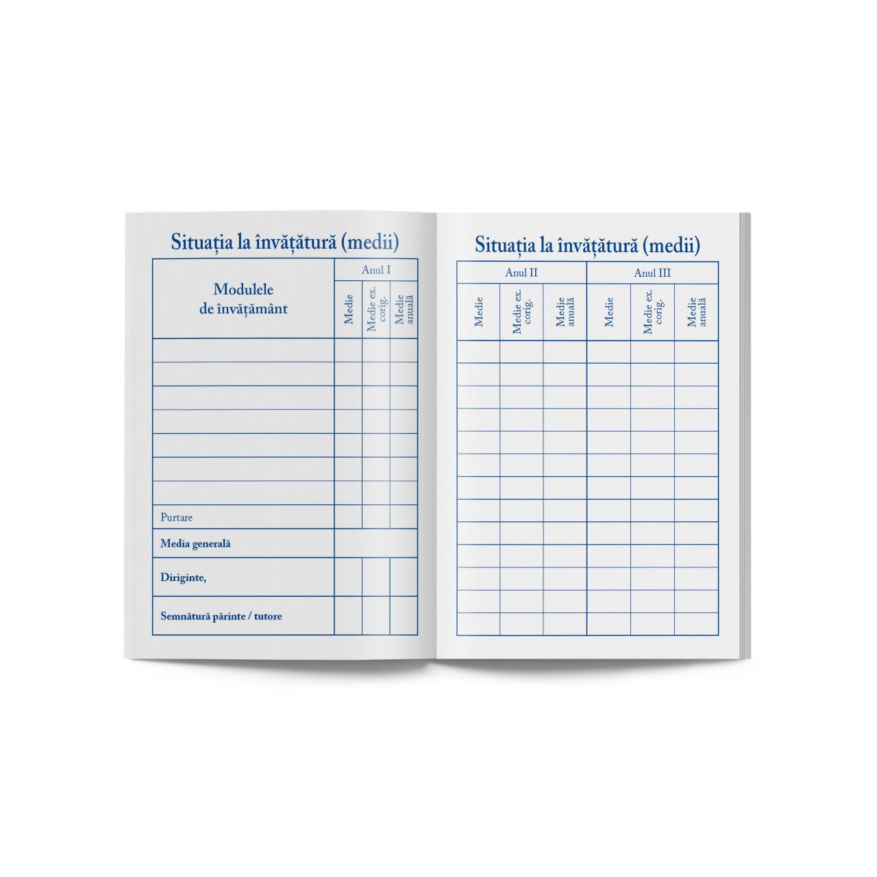 Interior: 32 pagini, tipar cu albastru, hartie offset de 80g