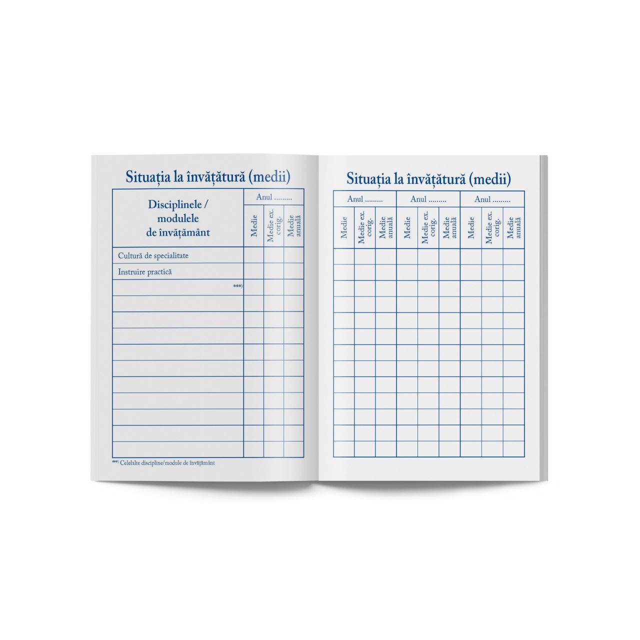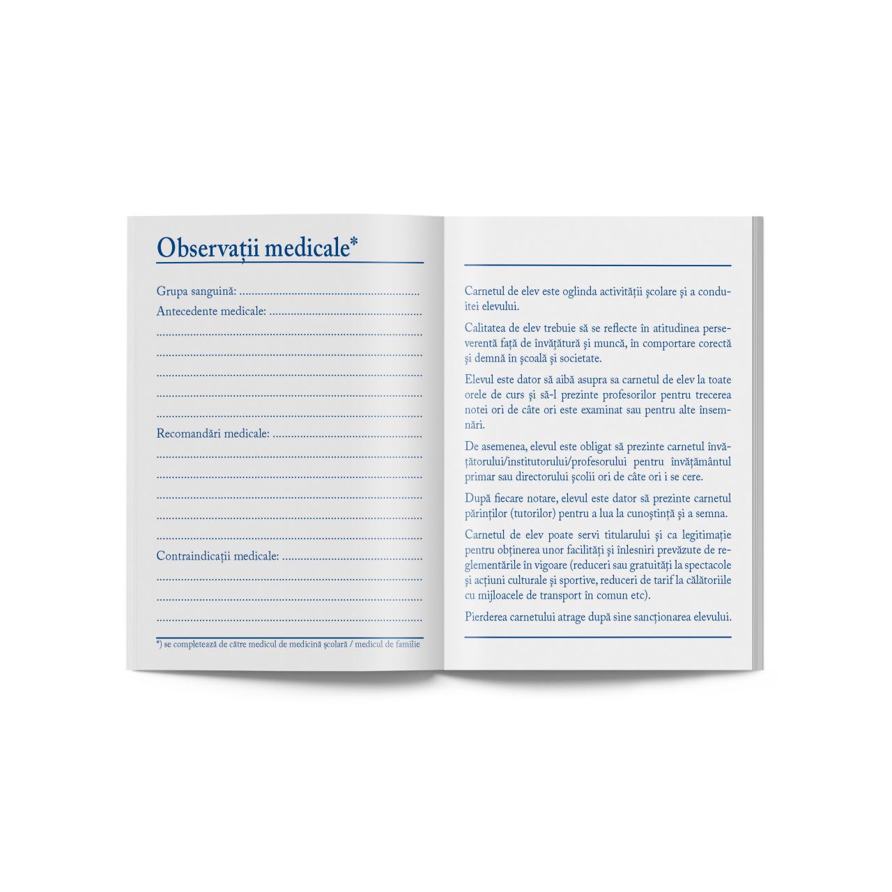 Interior: 32 pagini, tipar cu albastru, hartie offset de 80g