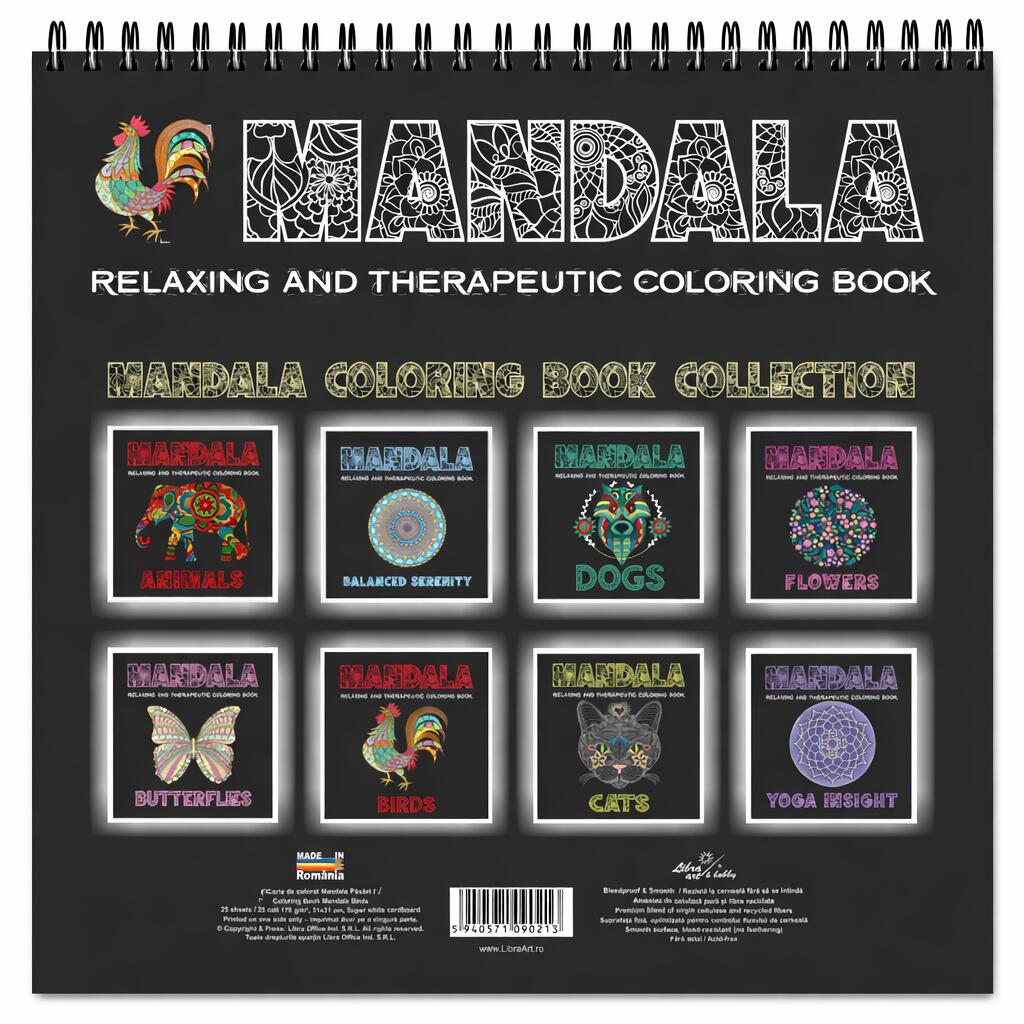 În interior vei descoperi o colecție de păsări stilizate în compoziții mandala, unde penele, aripile și formele naturale sunt transformate în modele decorative complexe. Fiecare ilustrație combină motive florale, forme geometrice și elemente ornamentale care creează imagini armonioase inspirate de frumusețea acestei lumi.