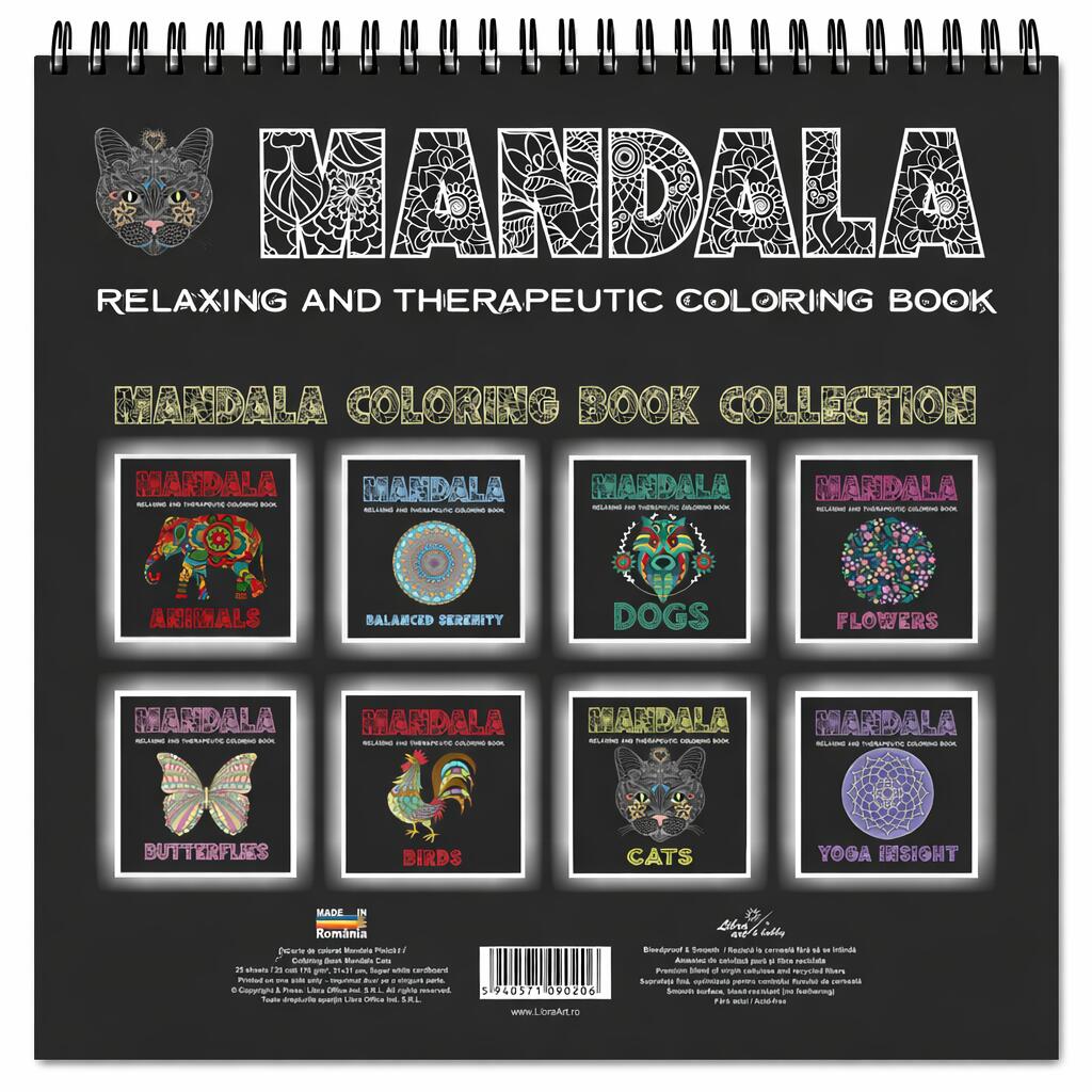 În interior vei descoperi o colecție de pisici stilizate în compoziții mandala, unde trăsăturile grațioase ale felinelor sunt reinterpretate prin motive florale, forme geometrice și ornamente decorative. Fiecare portret surprinde expresivitatea și misterul pisicilor, transformând imaginea lor într-o compoziție artistică echilibrată.