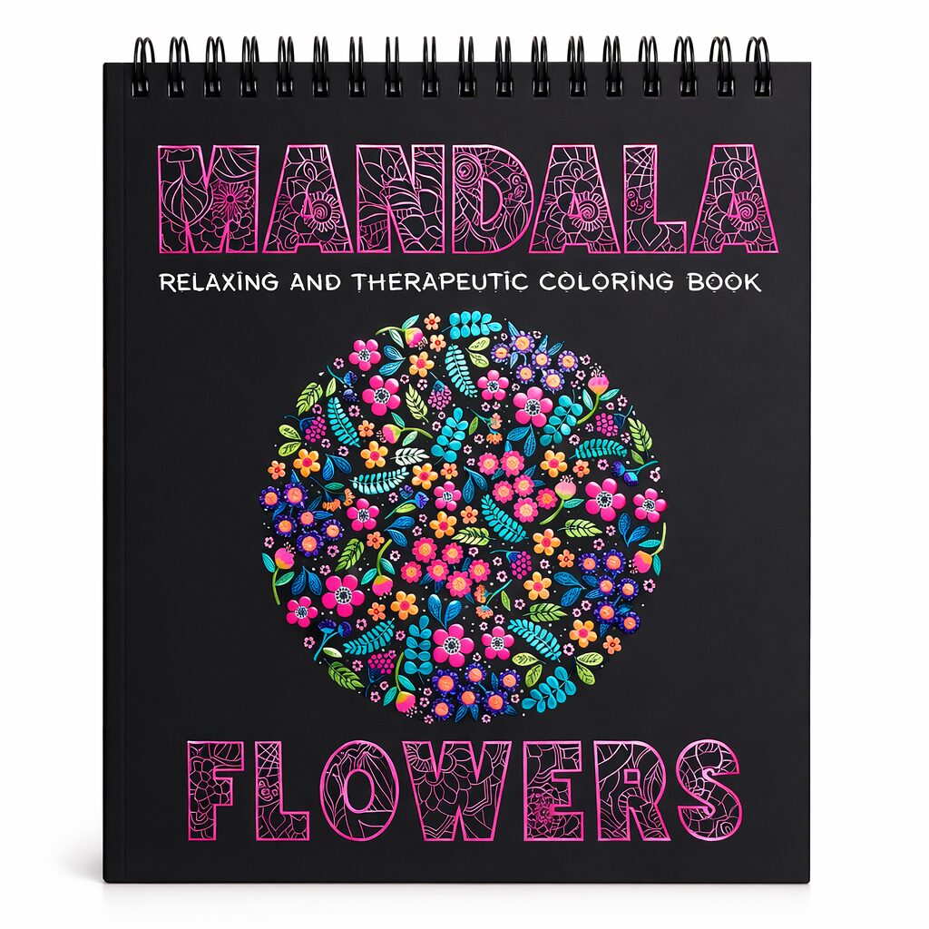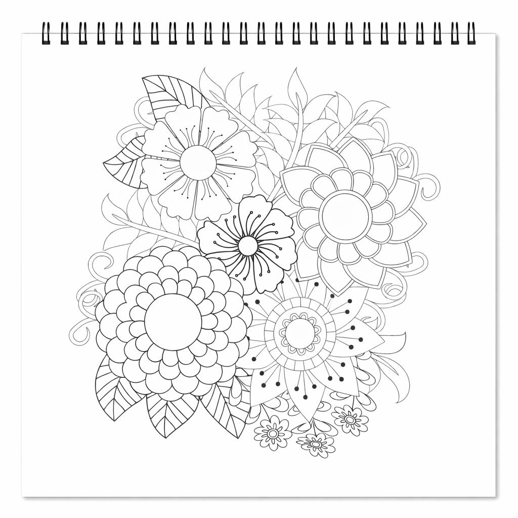 În interior vei descoperi o colecție de flori stilizate în compoziții mandala, unde petale, frunze și elemente botanice se îmbină în modele decorative echilibrate. Fiecare pagină transformă motivele florale în structuri artistice pline de ritm și simetrie.