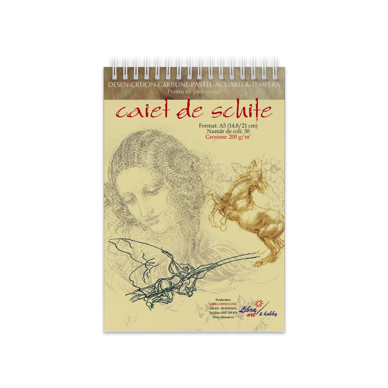 Caietul de schite Libra, format A5, este realizat din carton de 200 gr/mp Fedrigoni texturat, are 30 file, coperta cu tipar policromie, spatele este din carton de legatorie (mucava) si este legat cu spirala metalica dubla. Datorita calitatii deosebite al cartonului poate fi folosit pentru creion, carbune, acuarela, tempera, etc.