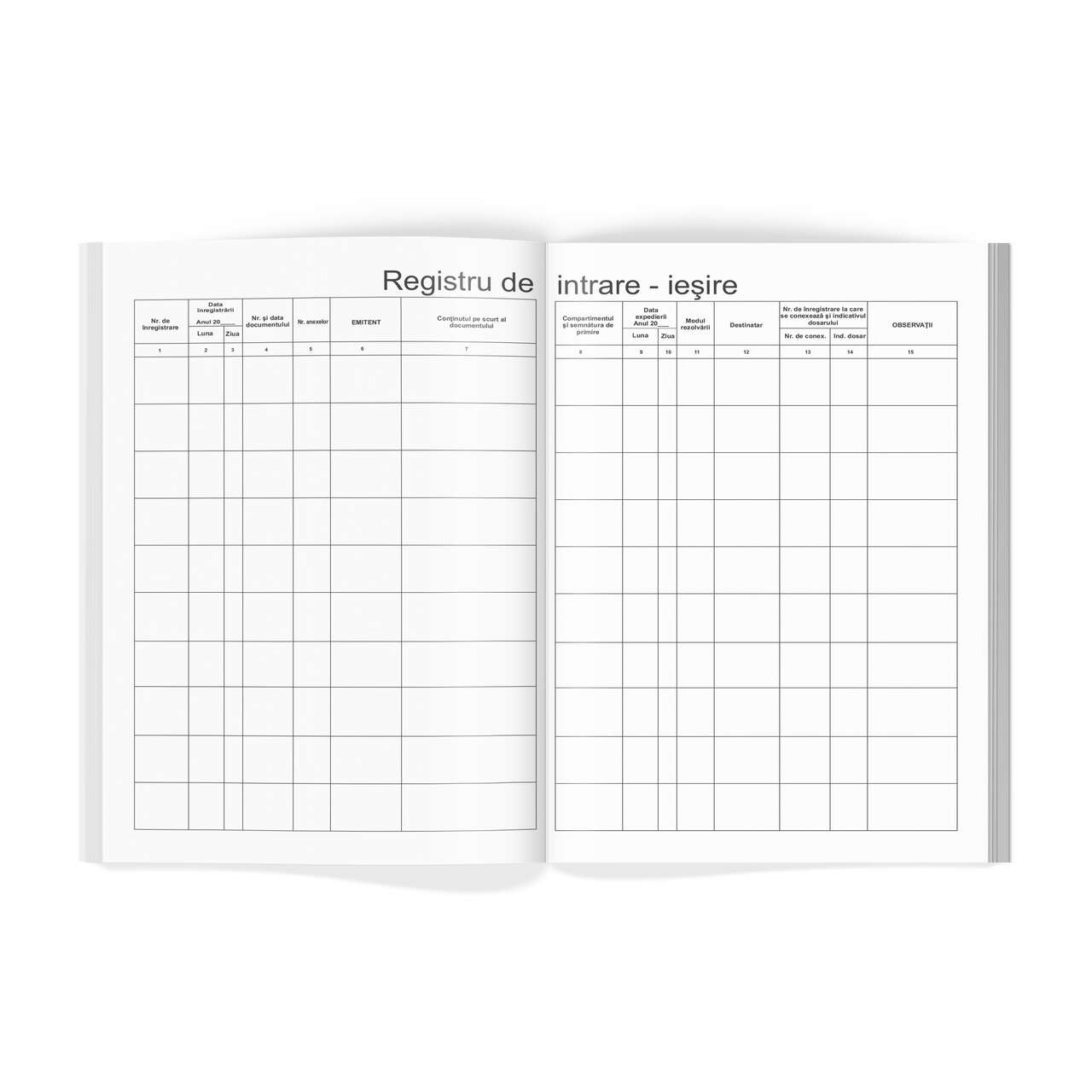 Registru intrare-iesire este disponibil in carnete A4 de 100 de file tiparite pe hartie offset super white 60 g, coperta alba fata-spate, legate prin capsare.