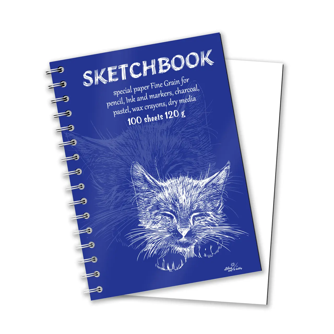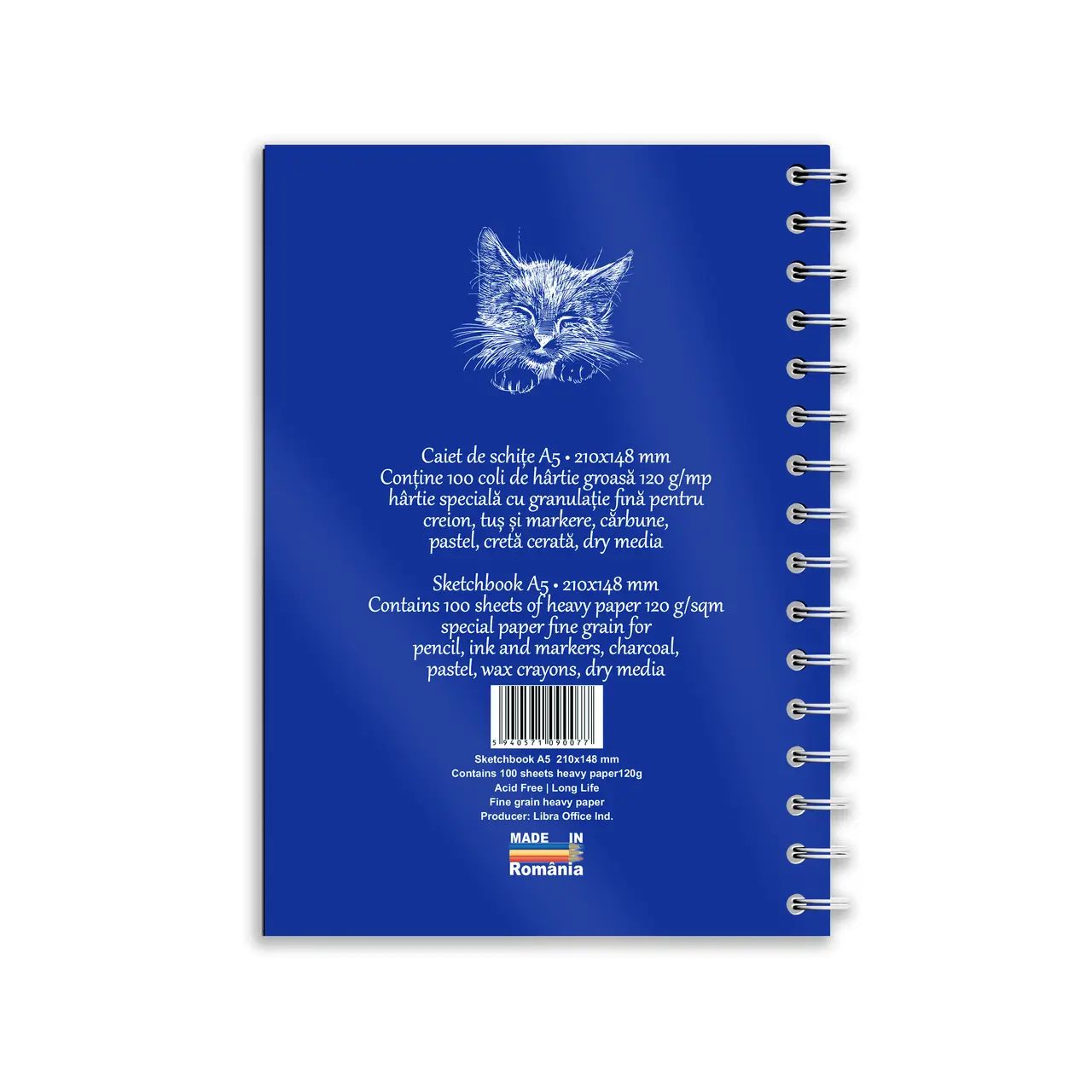 Bloc pentru schite format A5 (210x148 mm), contine 100 coli de hartie speciala groasa de 120g, coperta fata/verso din carton caserat de1.2 mm laminat lucios, legare cu spirala dubla metalica.