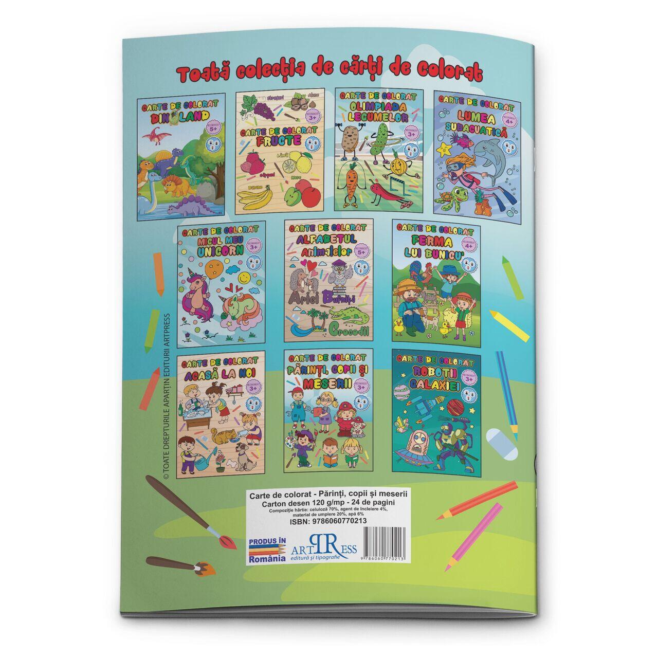 Carte de colorat Parinti, Copii si Meserii, format A4, 24 de pagini, interior carton desen de 120g/mp, coperta din carton 200g/mp laminata lucios. Datorita cartonului pentru desen de foarte buna calit...