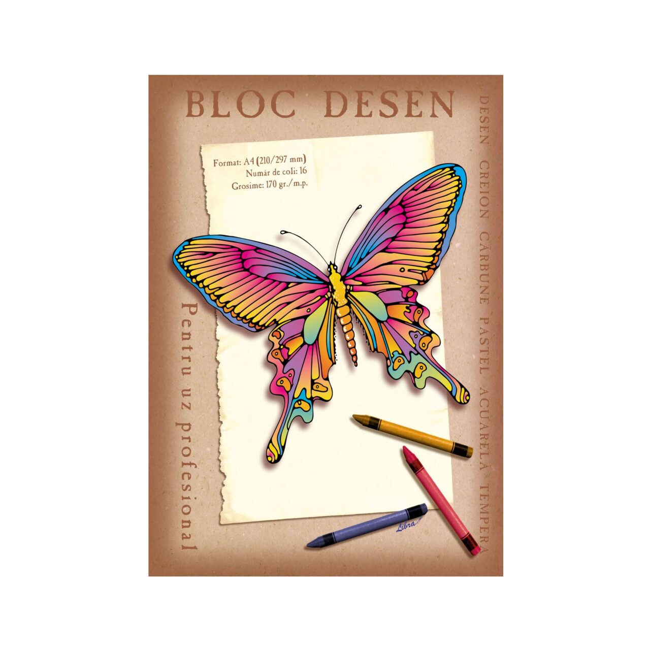 Blocul de desen Libra, format A4 este realizat din carton pentru desen de 170 g/mp, are 16 file lipite pe latura mica si coperta de carton lucios cu tipar policromie. Spatele este din mucava tare, setul de hartie este lipit pe latura mica. Cartonul gros din interior permite diverse tehnici de desen: culori, creion, acuarela, tempera, acril, carioca, graphite, etc.