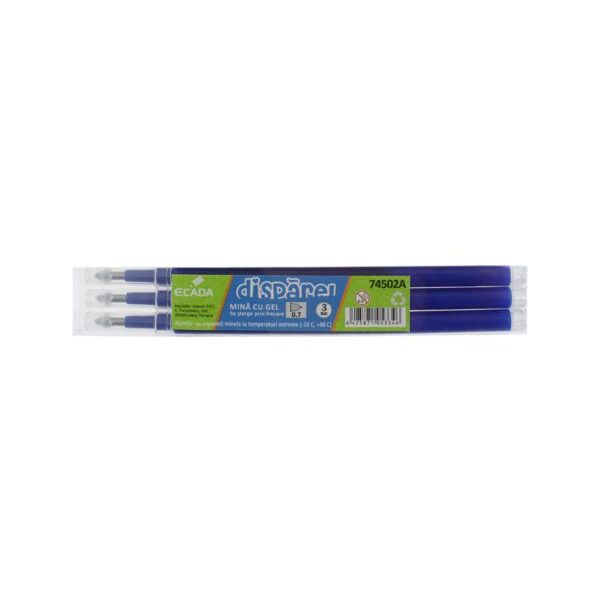• Culoare: albastru, perfectă pentru scris clar și vizibil.• Cerneală termosensibilă: dispare prin frecare, fără a deteriora hârtia.• Refolosibilă: se poate rescrie imediat după ștergere.• Setul conține: 3 bucăți, potrivite pentru rezerve de pixuri compatibile.
