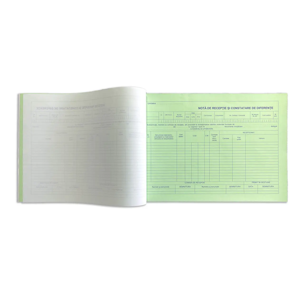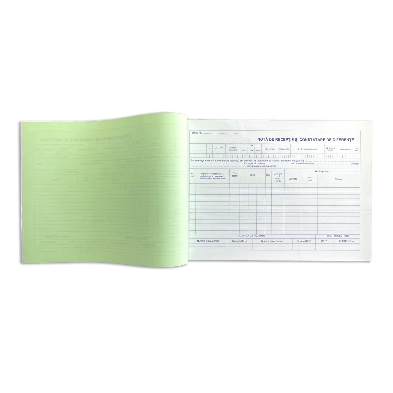 Nota de receptie autocopiativa, in doua exemplare este disponibil in carnete de 100 de file (50 de seturi) tiparite cu albastru pe hartie autocopiativa, primul exemplar alb, al doilea exemplar verde, coperta alba in fata / verso, legare prin capsare.