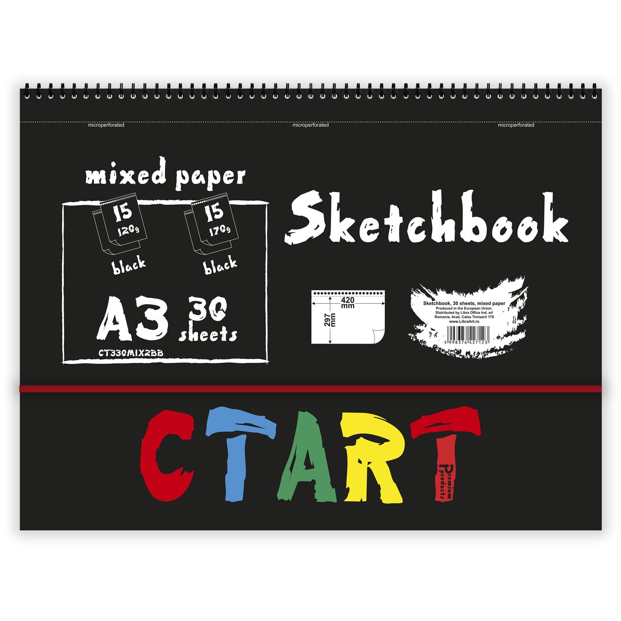 Sketchbook / Caiet de schite format A3 (420x297 mm), 30 coli, 15 coli carton negru 170g, 15 coli carton negru 120g, inchidere cu elastic. Dimensiunea hartiei este cea utila, masurata de la microperfor.