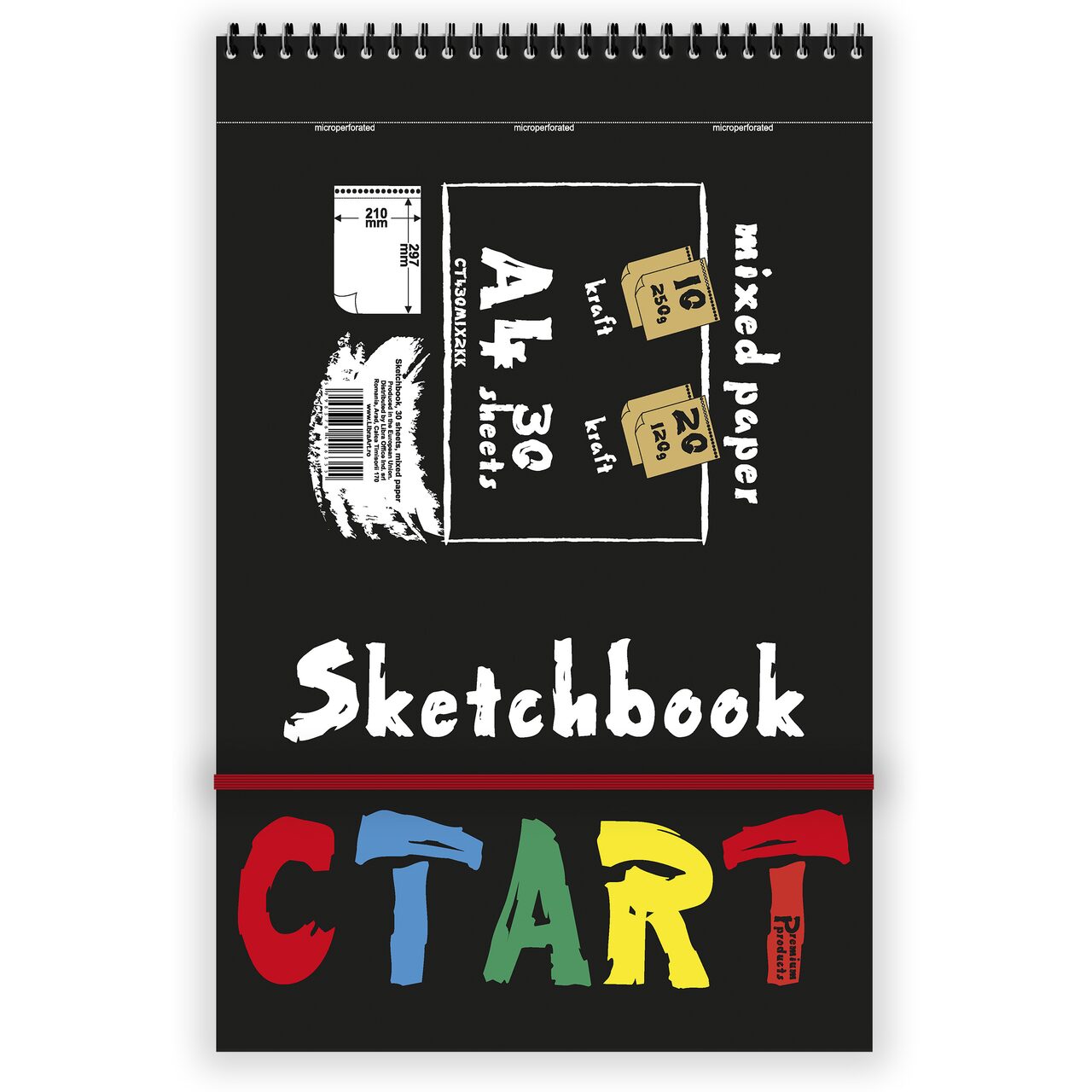 Sketchbook / Caiet de schite format A4 (297x210 mm), 30 coli, 10 coli carton kraft 250g, 20 coli carton kraft 120g, inchidere cu elastic. Dimensiunea hartiei este cea utila, masurata de la microperfor.